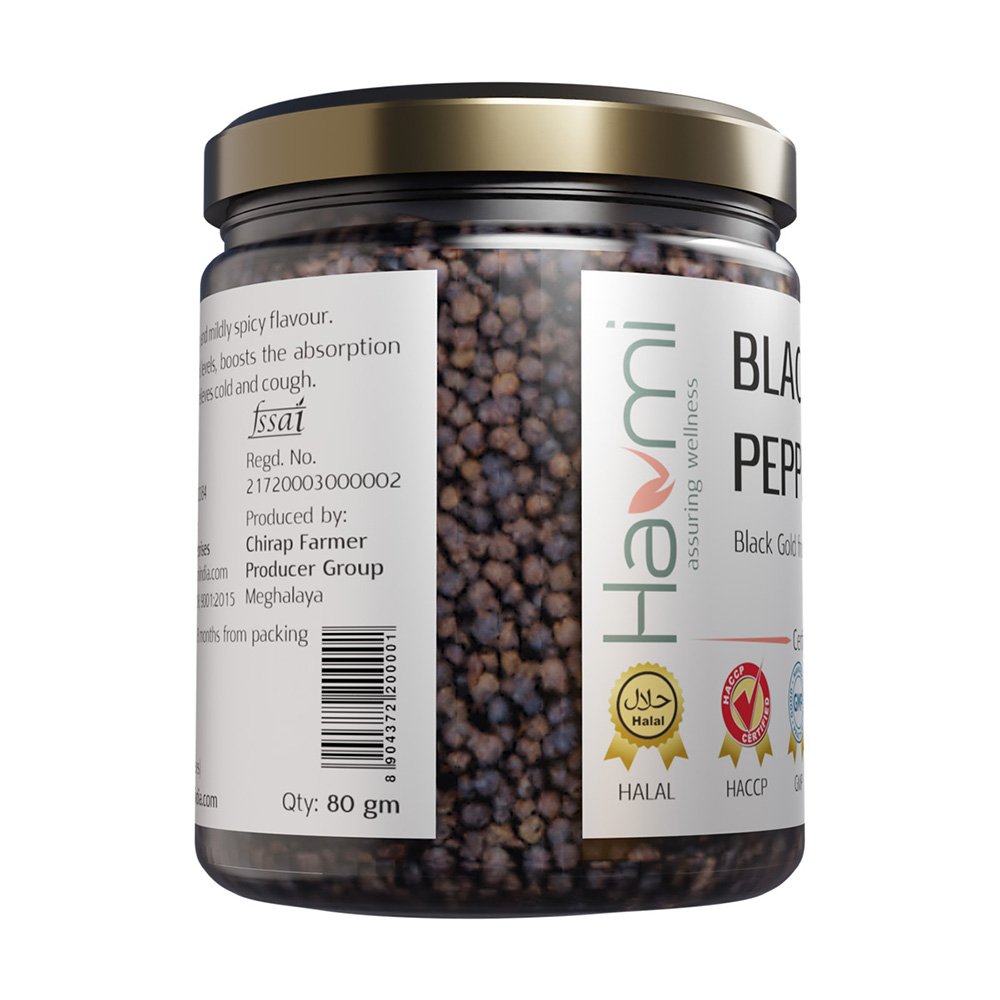 These black peppercorns are handpicked at the right maturity and optimally processed to preserve all the goodness and aroma. Our black peppercorns, packed in eco-friendly, aroma lock, re-sealable packs ensure you receive the product as fresh an aroma-rich. Havmi's peppercorns are preservative-free.